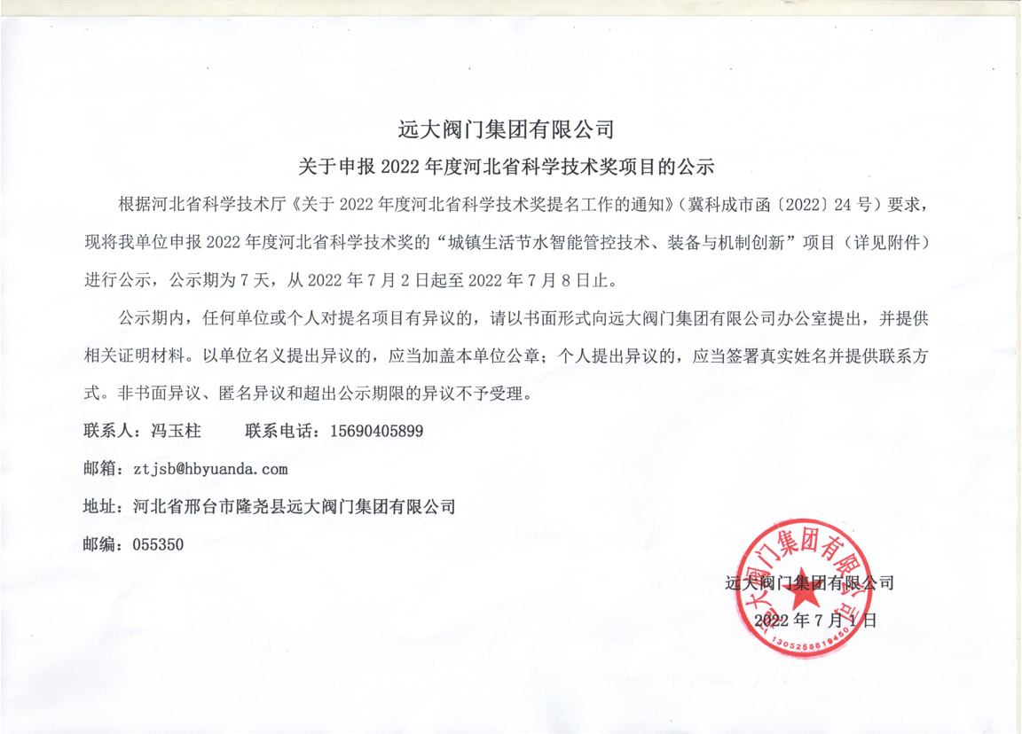 遠大閥門集團有限公司關(guān)于申報2022年度河北省科學技術(shù)獎項目的公示 根據(jù)河北省科學技術(shù)廳《關(guān)于2022年度河北省科學技術(shù)獎提名工作的通知》(冀科成市函〔2022〕24號)要求,現(xiàn)將我單位申報2022年度河北省科學技術(shù)獎的“城鎮(zhèn)生活節(jié)水智能管控技術(shù)、裝備與機制創(chuàng)新”項目(詳見附件)進行公示,公示期為7天,從2022年7月2日起至2022年7月8日止。 公示期內(nèi),任何單位或個人對提名項目有異議的,請以書面形式向遠大閥門集團有限公司辦公室提出,并提供相關(guān)證明材料。以單位名義提出異議的,應當加蓋本單位公章;個人提出異議的,應當簽署真實姓名并提供聯(lián)系方式。非書面異議、匿名異議和超出公示期限的異議不予受理。