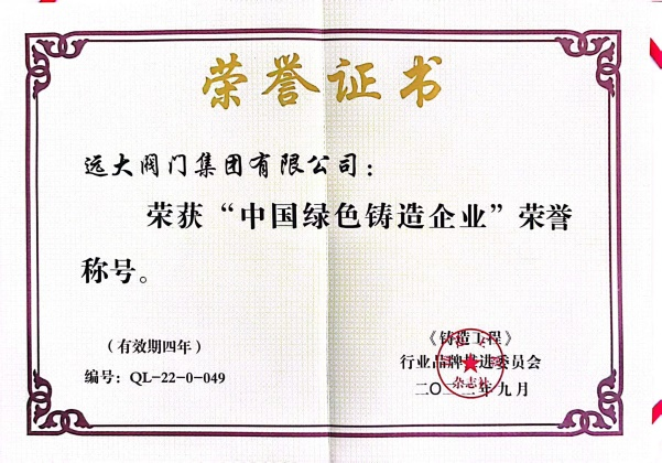 2022年9月20日,中國(guó)鑄造協(xié)會(huì)在上海組織召開了年會(huì),并舉行了“中國(guó)綠色鑄造企業(yè)”榮譽(yù)稱號(hào)授牌儀式,遠(yuǎn)大閥門集團(tuán)有限公司獲得了“中國(guó)綠色鑄造企業(yè)”榮譽(yù)稱號(hào)。